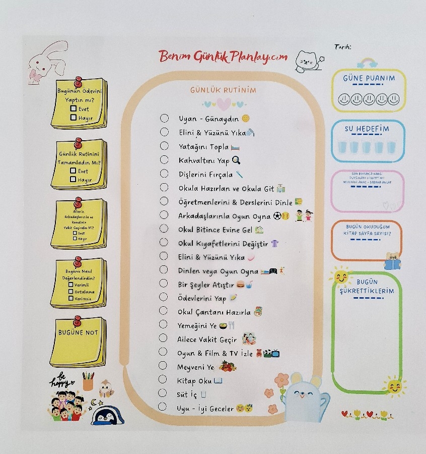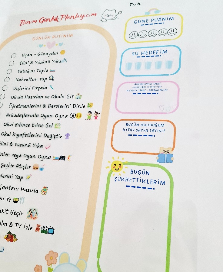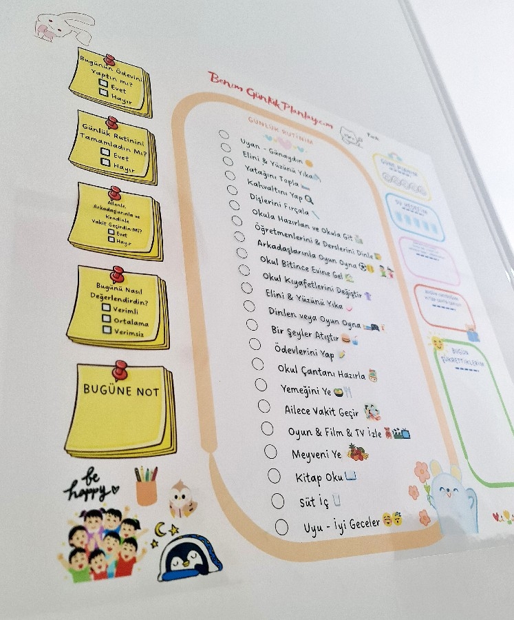 Tamamen Özel Tasarım sahip ürün çocuklarınıza sorumluluk kazandırmaya yönelik üretilmiştir. 50*50 cm dir. Tasarımı çocuklar için ilgi çekicidir ve renkleri canlıdır. Şeffaftır ve uygulandığı yüzeyin rengini almaktadır. Kendine ait kilit başlıklı tüpü ve kullanım kılavuzu ile gönderilmektedir. Ürün Kullanım Talimatları: Ürünü halıya, masaya, yere açma serme yapmayınız. Duvara, cama, tahtaya uygulanır. Kolay kurulumludur. Yapıştırma gerektirmez, kendiliğinden yapışır. Nemli bez yada ıslak mendil kullanılmaz, kuru silme yapılmalıdır. Yaz-Sil ürünlerde beyaz tahta kalemi kullanılır. Uygulamadan önce yüzeyin tozunu mutlaka alınız. Kıvrım yeri içeride kalacak şekilde uygulanır. Sürekli söküp takma da tutunma özelliği azalır. Aşırı pürüzlü yüzeylerde tutunma özelliği az olabilir. Daha fazla tutunma için çift taraflı bantla desteklenebilir. Patentli üründür.